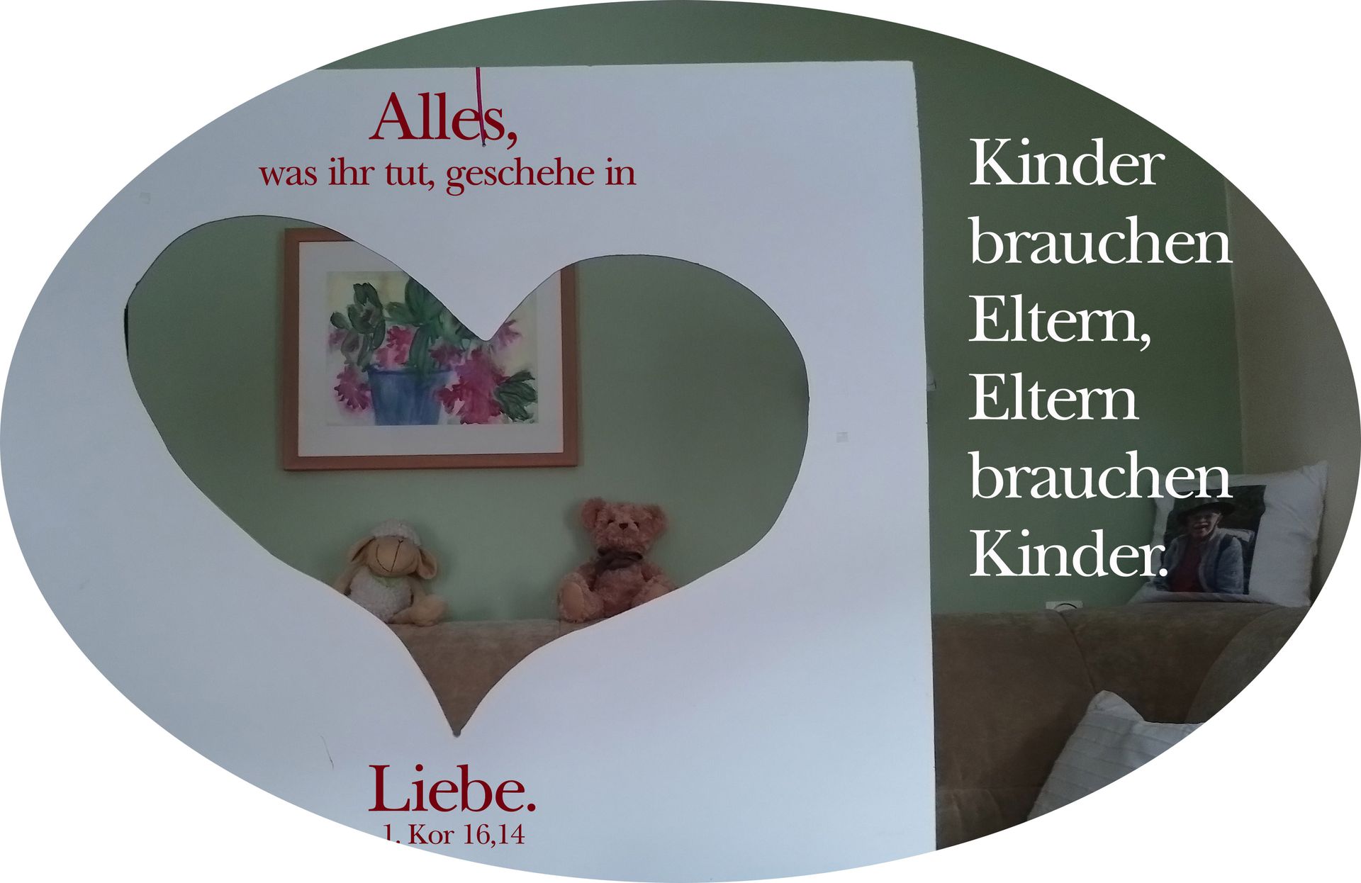 Die Kreuzform des Gesamtbildes weist symbolisch auf Jesus, die Liebe in Person hin.